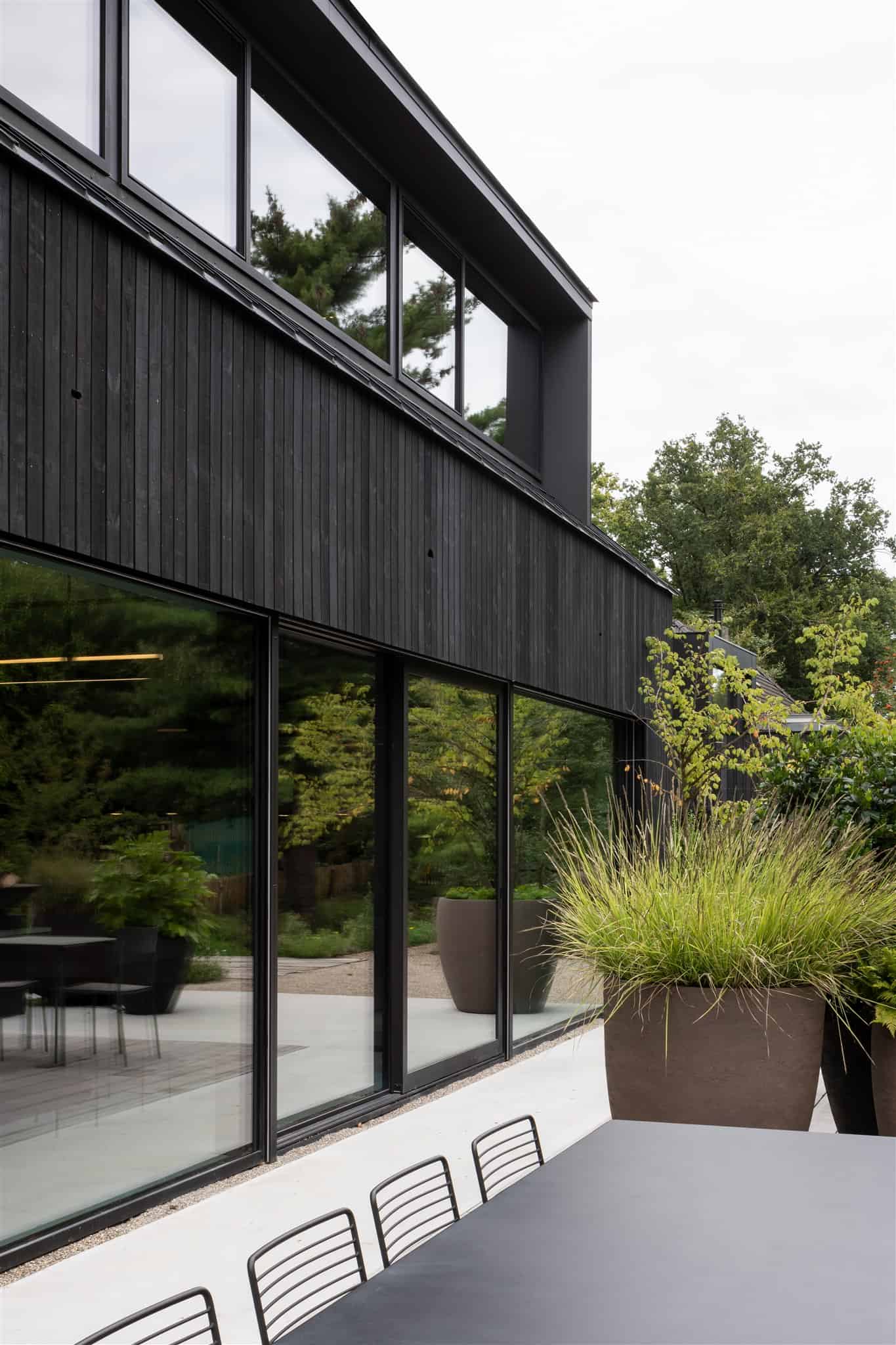 De Black Barn is een voorbeeld van natuurinclusieve architectuur. We kozen voor duurzame materialen en een slimme bouwmethode die de biodiversiteit stimuleert. Een geboorde fundering stelde ons in staat om op duurzame wijze op korte afstand van de grote eiken te bouwen. De gevel is ingetogen van karakter. Het naaldhout is thermisch verduurzaamd, zwart geolied en traditioneel bevestigd.