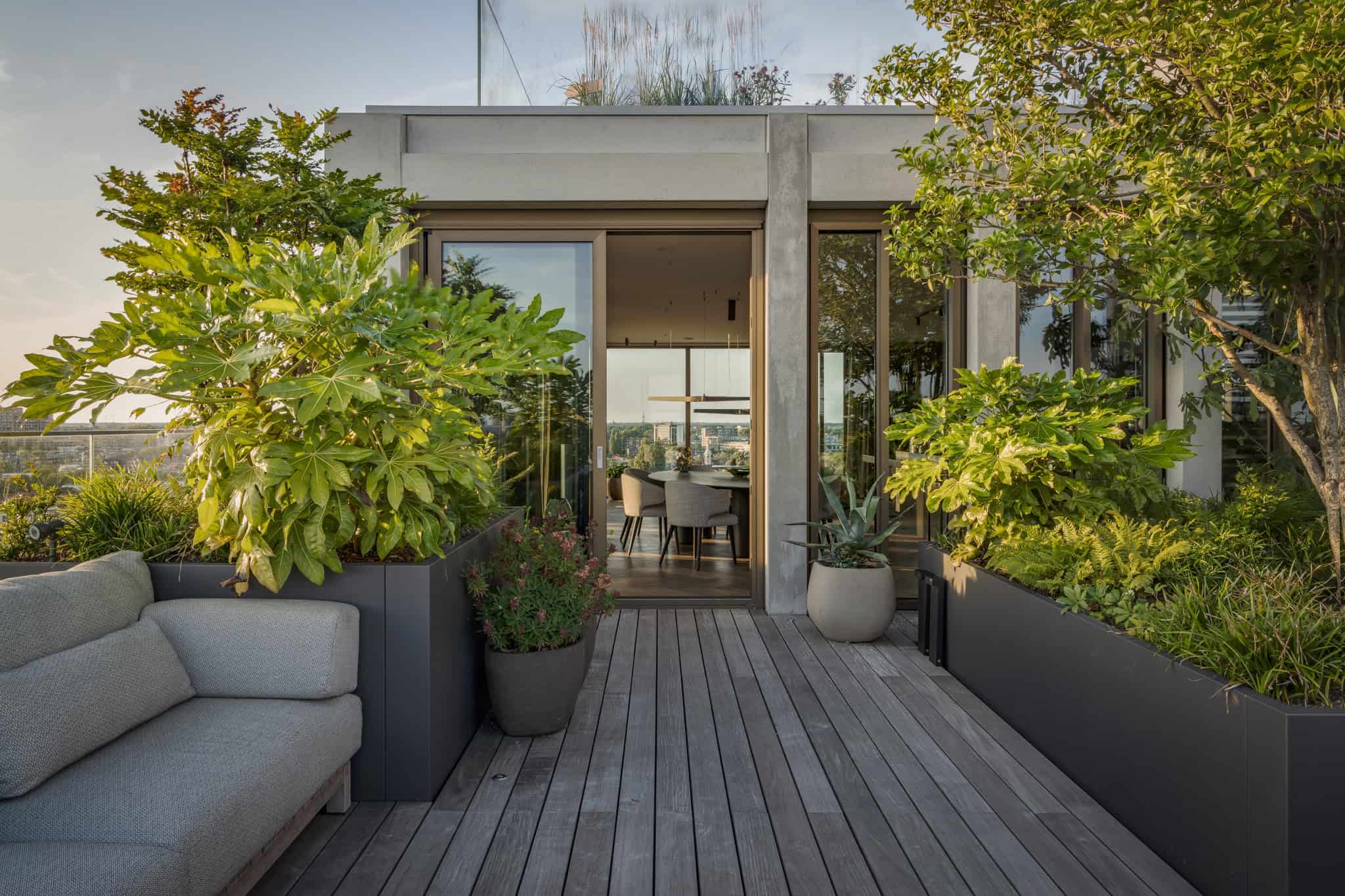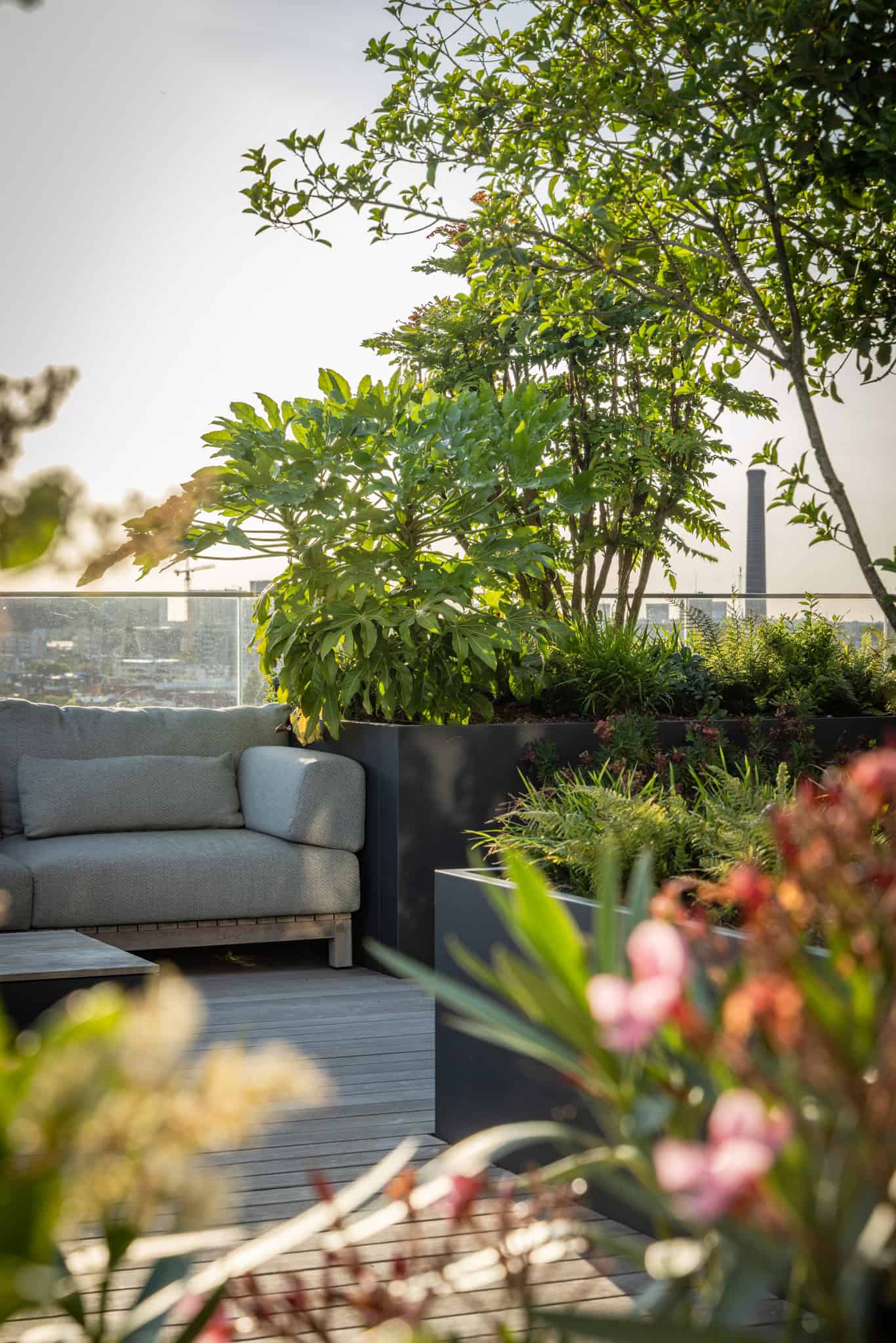 Toen de toren nog gebouwd moest worden, is Studio REDD al berokken geraakt bij het tuinontwerp voor deze daktuin en bijbehorende balkons. Door deze vroege samenwerking is er een daktuin ontstaan die qua sfeer en materiaalvoering naadloos aansluit op het penthouse.