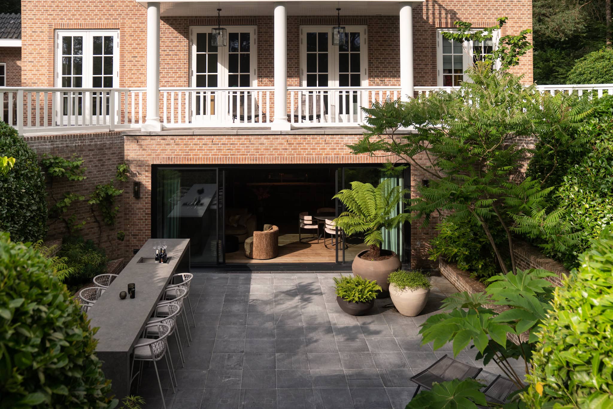 Je tuin is zoveel meer dan een verlengde van je huis. Het is een plek om te ontsnappen en verdwijnen. Maar hier is het het allebei. tussen de hoge bomen van het bos ligt deze verdiepte patio waar je door tropisch ogende planten wordt omgeven.